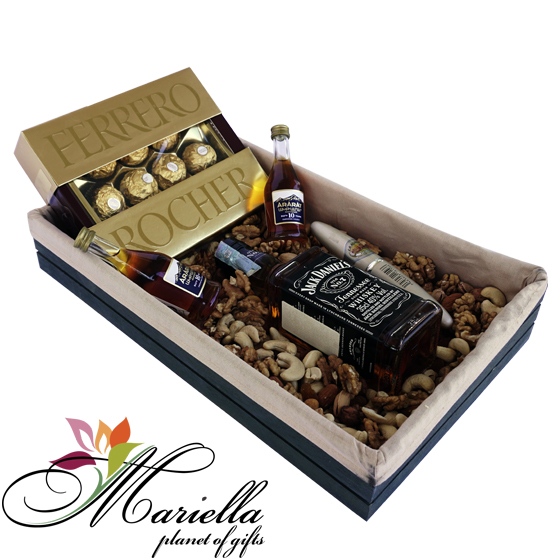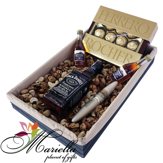 Կոնյակ, շոկոլադե կոնֆետների, վիսկի, սիգարի և չարազի … Հիանալի համադրություն՝ գեղեցիկ ձևավորմամբ: Տվյալ տուփը կդառնա հիանալի նվեր ցանկացած առիթով: