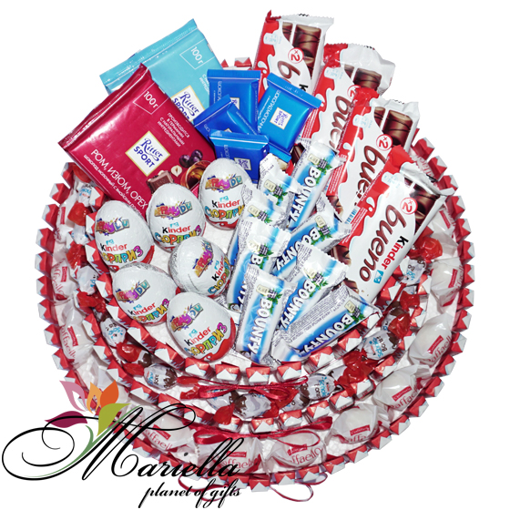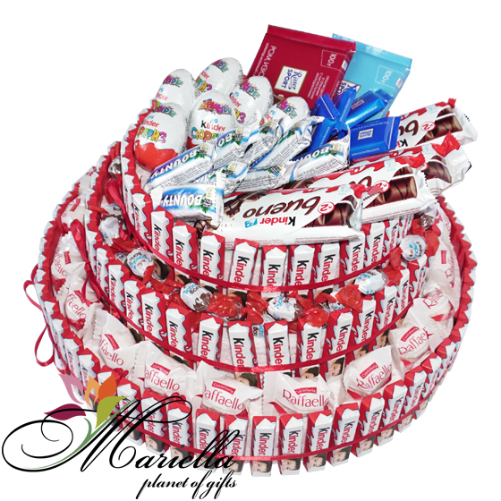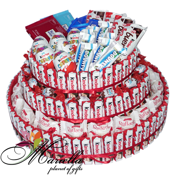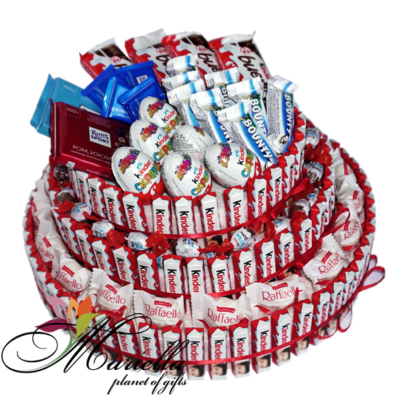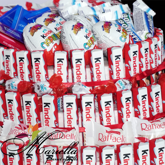 Համոզված ենք յուրաքանչյուր ոք սիրում է Kinder, Bounty, Raffaello, Ritter Sport, Kinder Schoko-Bons … Իսկ մենք այդ բոլորը համատեղել ենք մի տեղ և ստացել այսպիսի գեղեցիկ, համեղ, օրիգինալ, քաղցր կոմպոզիցիա: Հիանալի անակնկալ Ձեր սիրելիի համար: