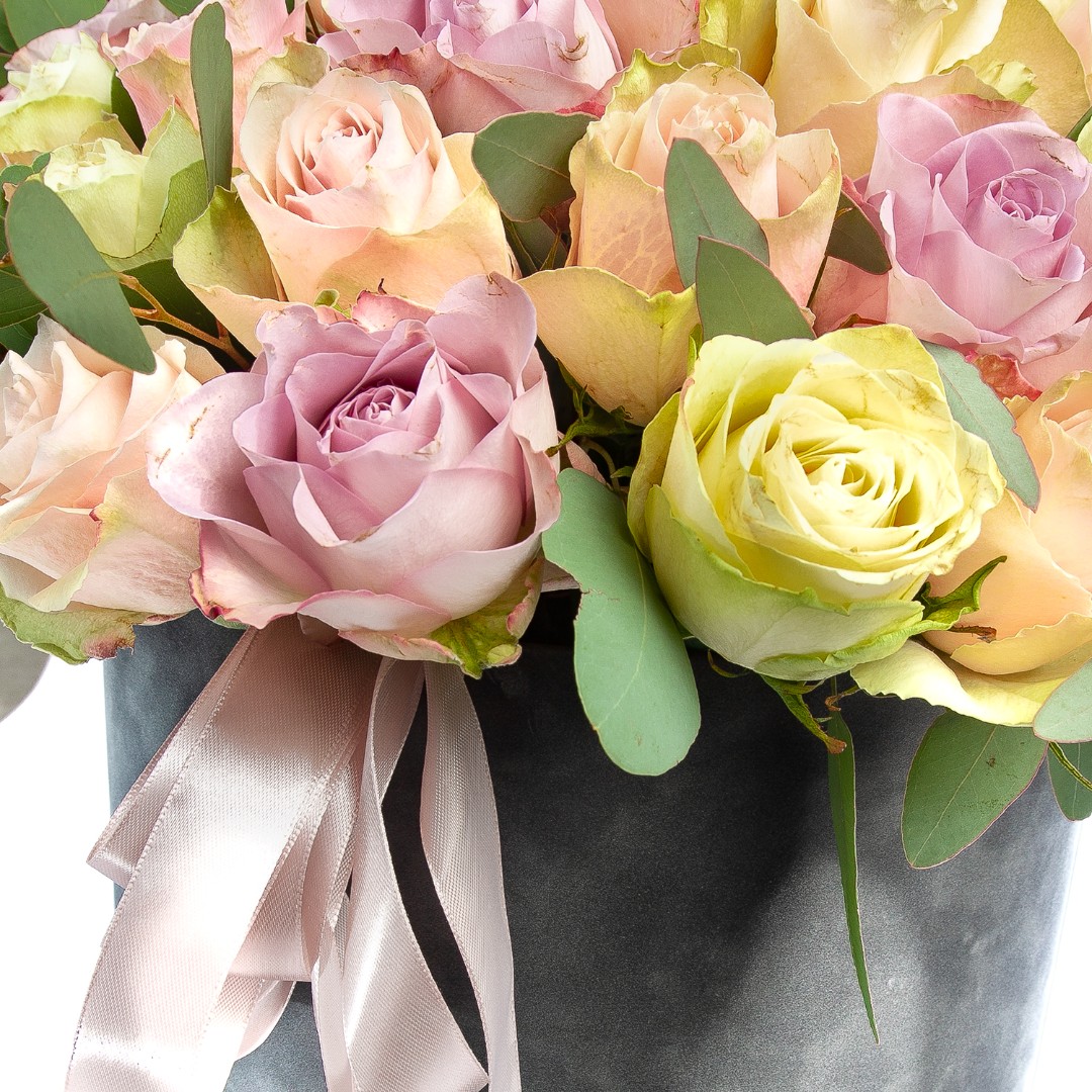 фиолетовые, белые, светло-жёлтые розы чудесно переплетаются очаровательной спиралью, символизируя жизнь, движение, новое начало. Такая цветочная композиция станет идеальным подарком для энергичных и целеустремленных людей. А классическая шкатулка придает этой цветочной композиции еще больше очарования и элегантности.