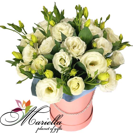 Изящная композиция из белых эустом (лиззиантусов) в стильной розовой шляпной коробке. Букет символизирует утонченность и романтику, идеально подходит для дня рождения, благодарности или просто для выражения нежных чувств.