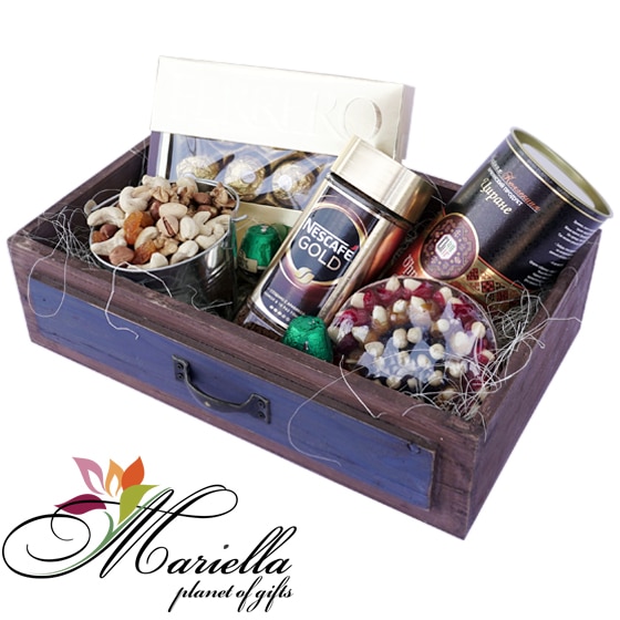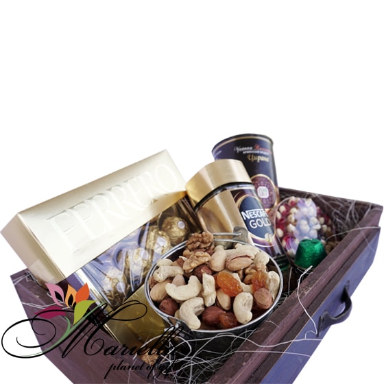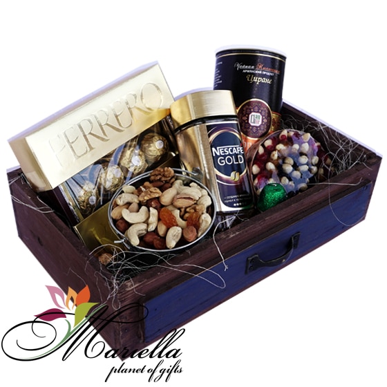Шоколадные конфеты, растворимый кофе, чай, сушеный миндаль – отличный сюрприз для всех, кого вы хотите порадовать. Спешите подарить эту красивую подарочную коробку любимому человеку, сделав его день полным любви, нежности и внимания.